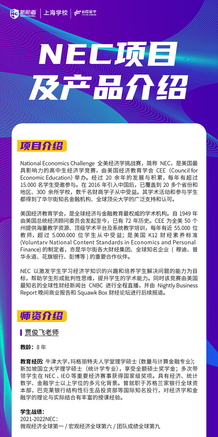 National Economics Challenge全美经济学挑战赛,简称NEC, 是美国最具影响力的高中生经济学竞赛,由美国经济教育学会CEE (Council for Economic Education)举办。经过20余年的发展与积累。