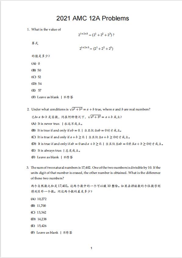 本文标题:2021年AMC12美国数学竞赛 真题+答案PDF高清版本下载