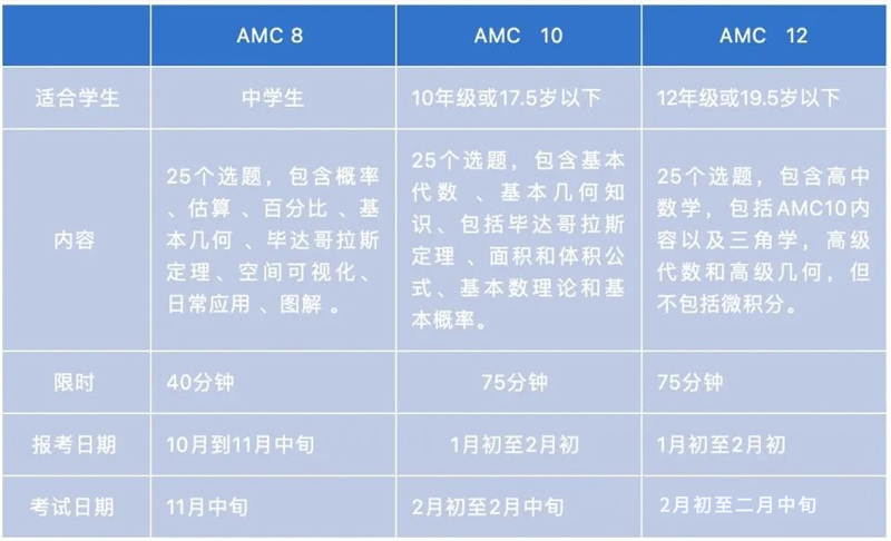 AMC是American Mathematics Competition美国数学竞赛的缩写,由美国数学协会(Mathematics Association of America)于1950年成立,全球的考生都可以参加。AMC主要分为AMC8、AMC10、 AMC12、AIME、USJMO、USAMO。
