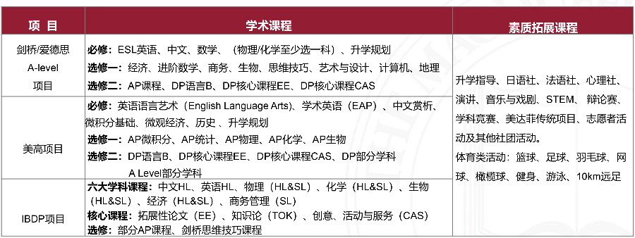 学校为独立全封闭花园式校园,占地60亩、12栋功能教学楼、公园环绕,400M田径足球场,3个篮球场,2个网球场,标准游泳馆,健身房,乒乓球馆,羽毛球馆,生物、化学和物理实验室等,同时提供星级自助餐式食堂和两人间宾馆级学生宿舍。现有国际文凭组织高中课程(IBDP)、美国大学先修课程(AP)和英国课程(IGCSE和A Level)三种课程体系,致力于为学生提供国际化的教学平台,采用国际化评价标准,以课程品质确保学生的学习效果。