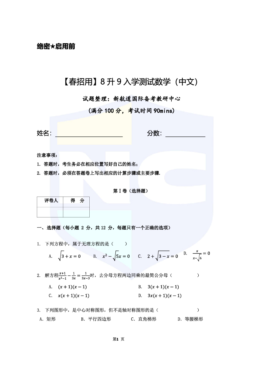 接下来我们一起来看一下"上海国际学校春季招生8升9入学测试数学卷(中文)版"。