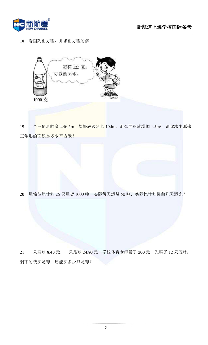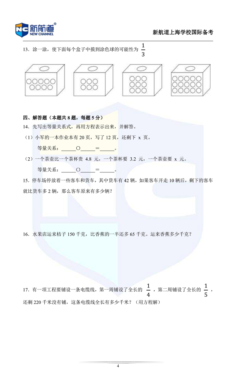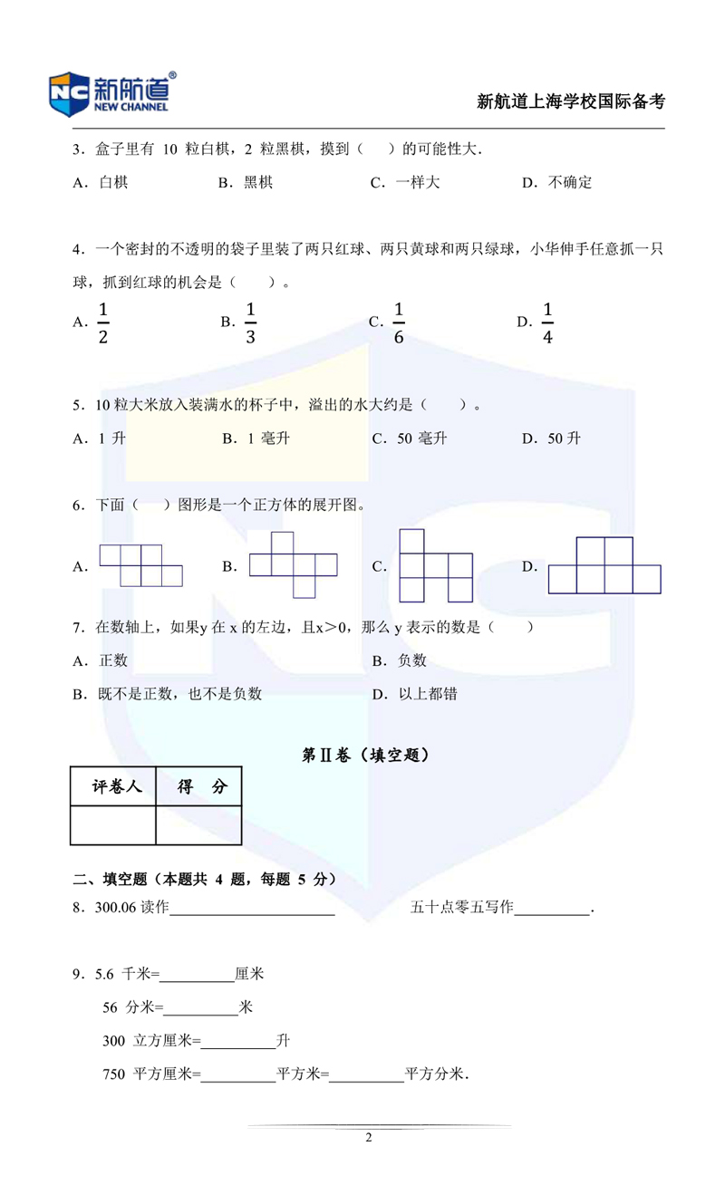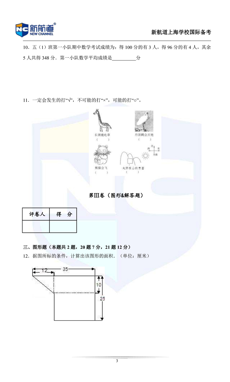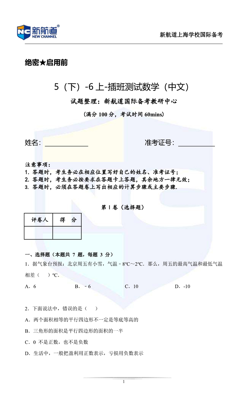 今天上海新航道国际学校小编,给同学们带来了"上海国际学校5(下)-6(上)-插班测试数学卷(中文板)"