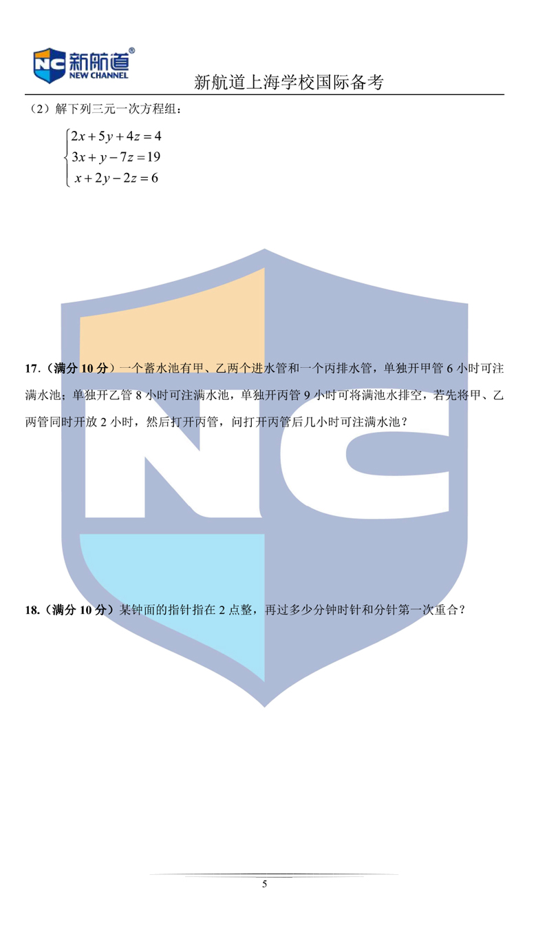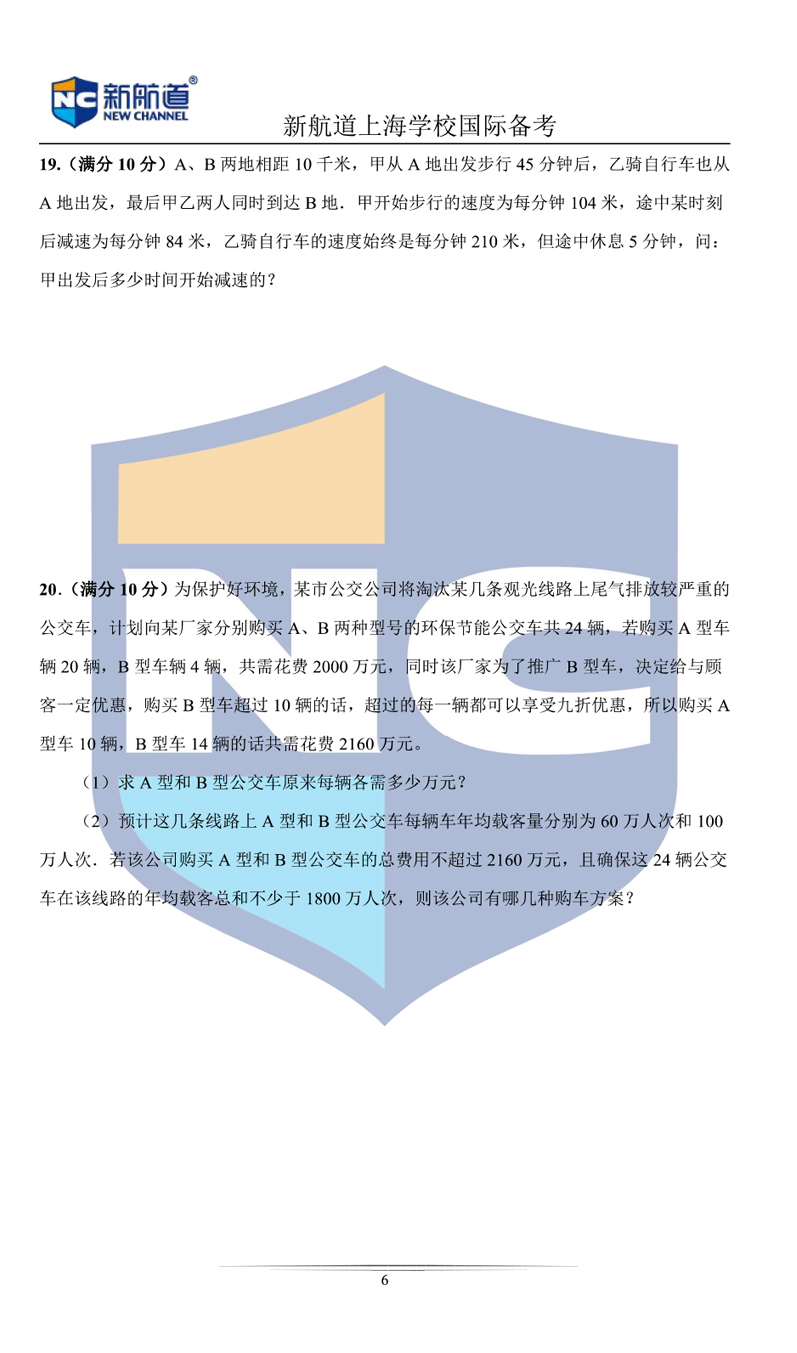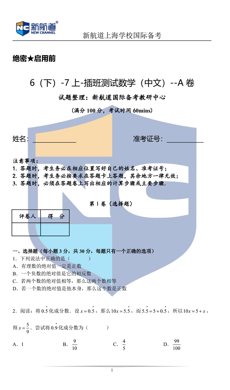 今天上海新航道国际学校小编,给同学们带来了"上海国际学校6(下)-7(上)-插班测试数学A卷(中文板)"