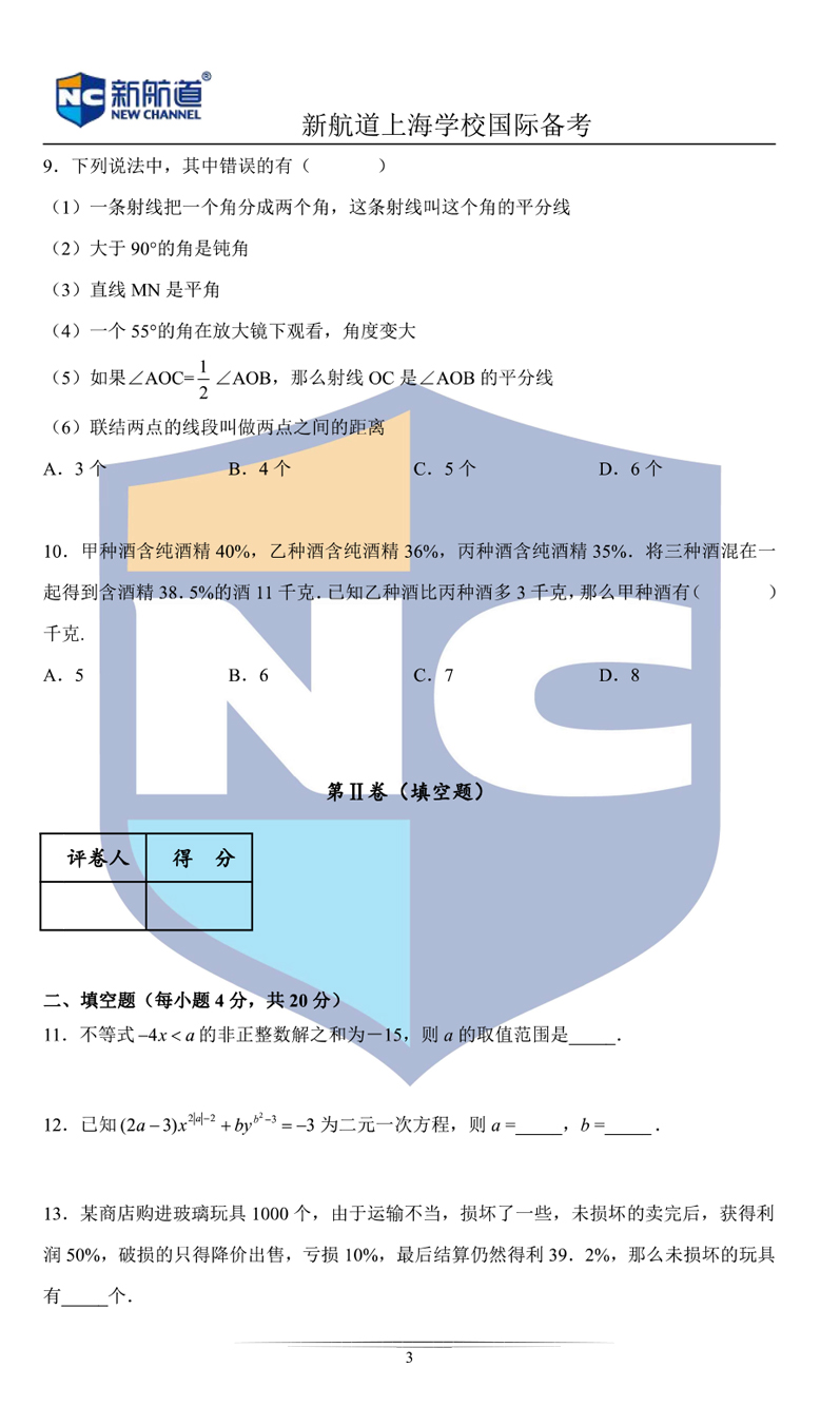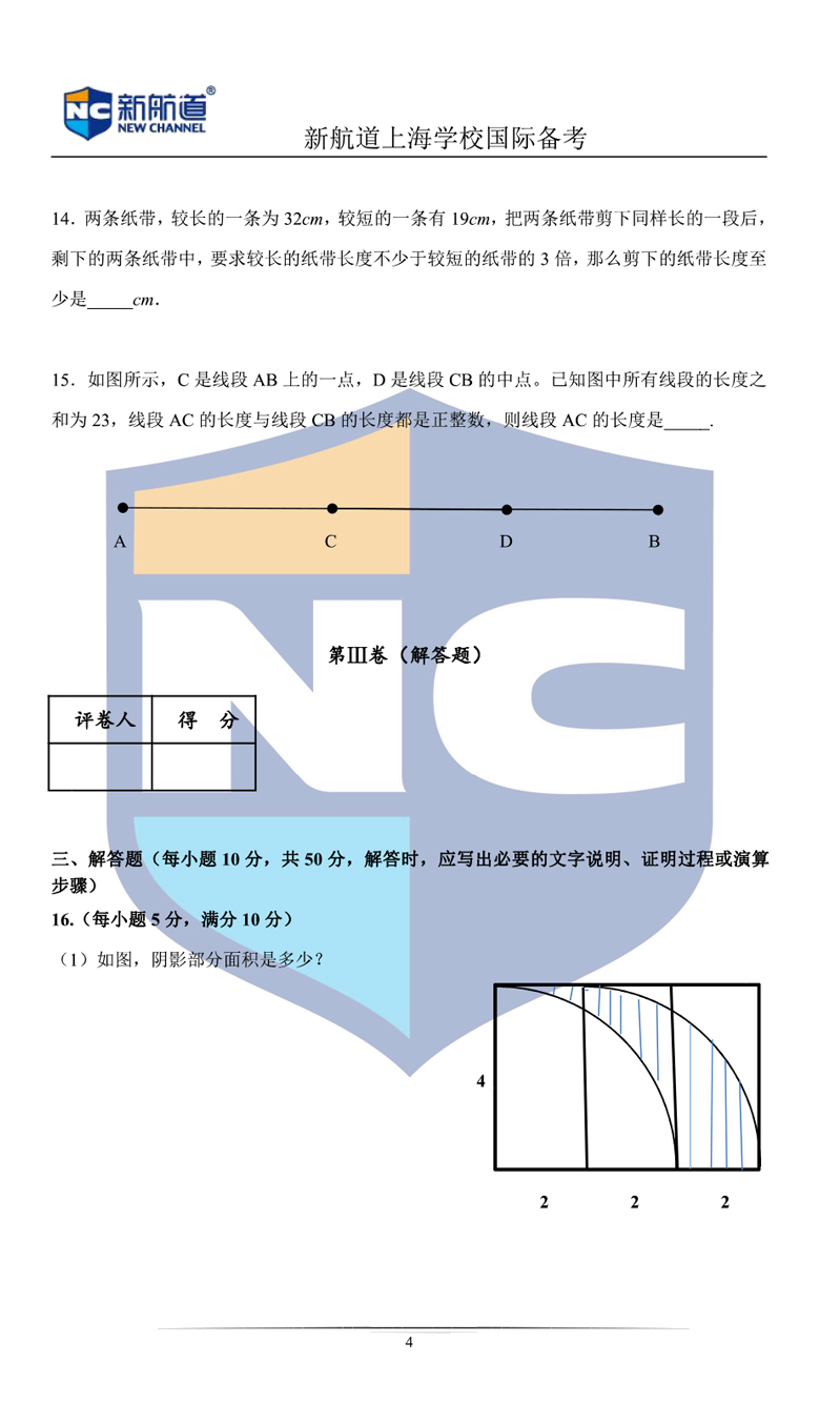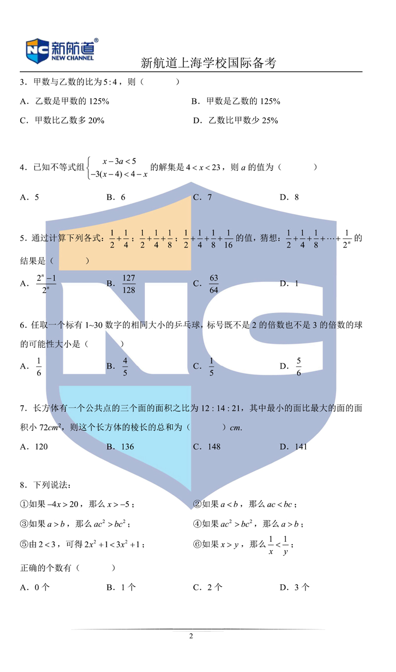 今天上海新航道国际学校小编,给同学们带来了"上海国际学校6(下)-7(上)-插班测试数学A卷(中文板)"
