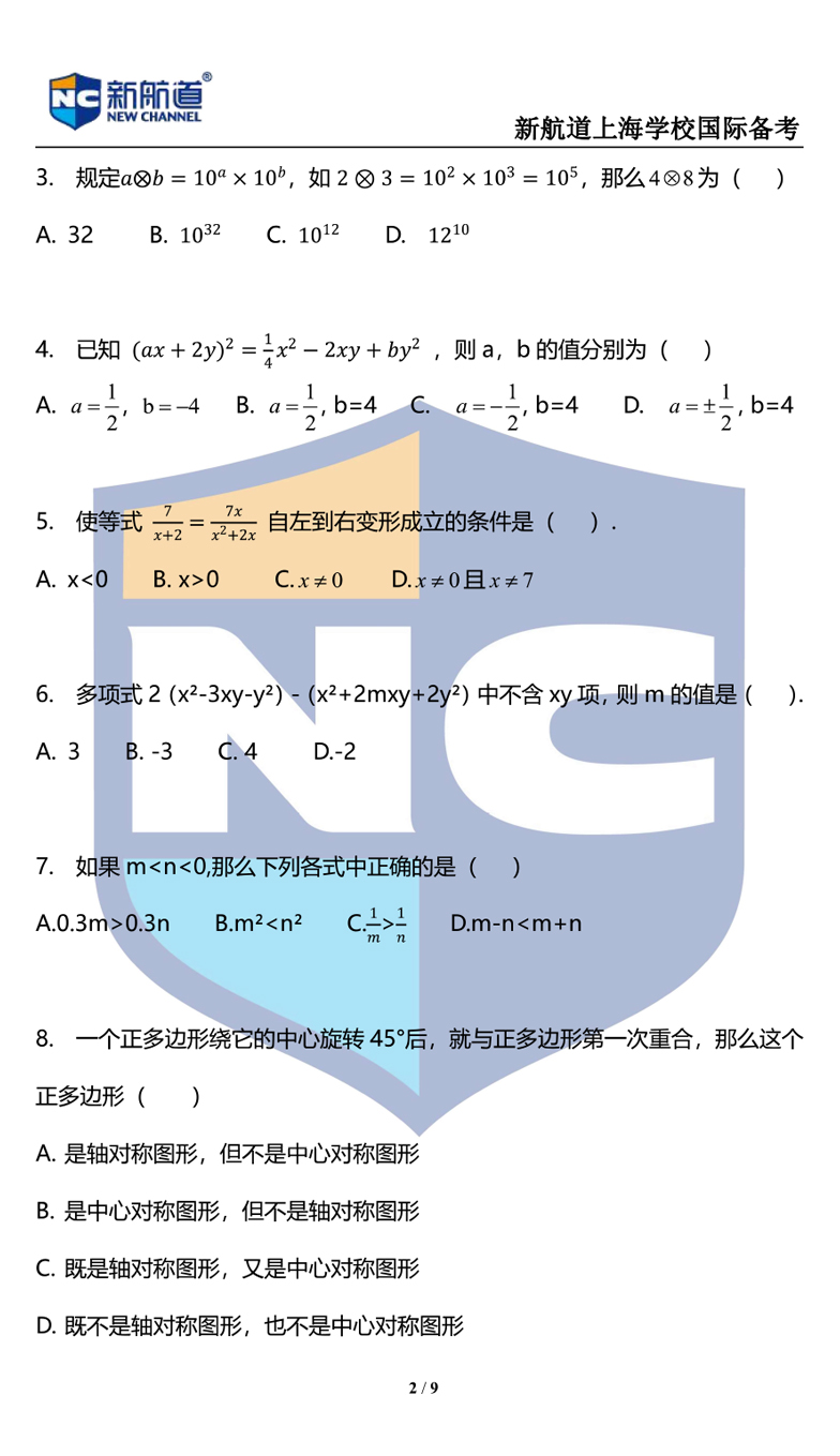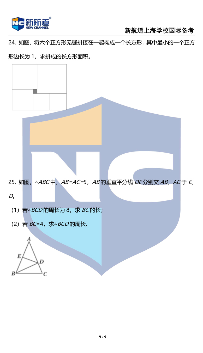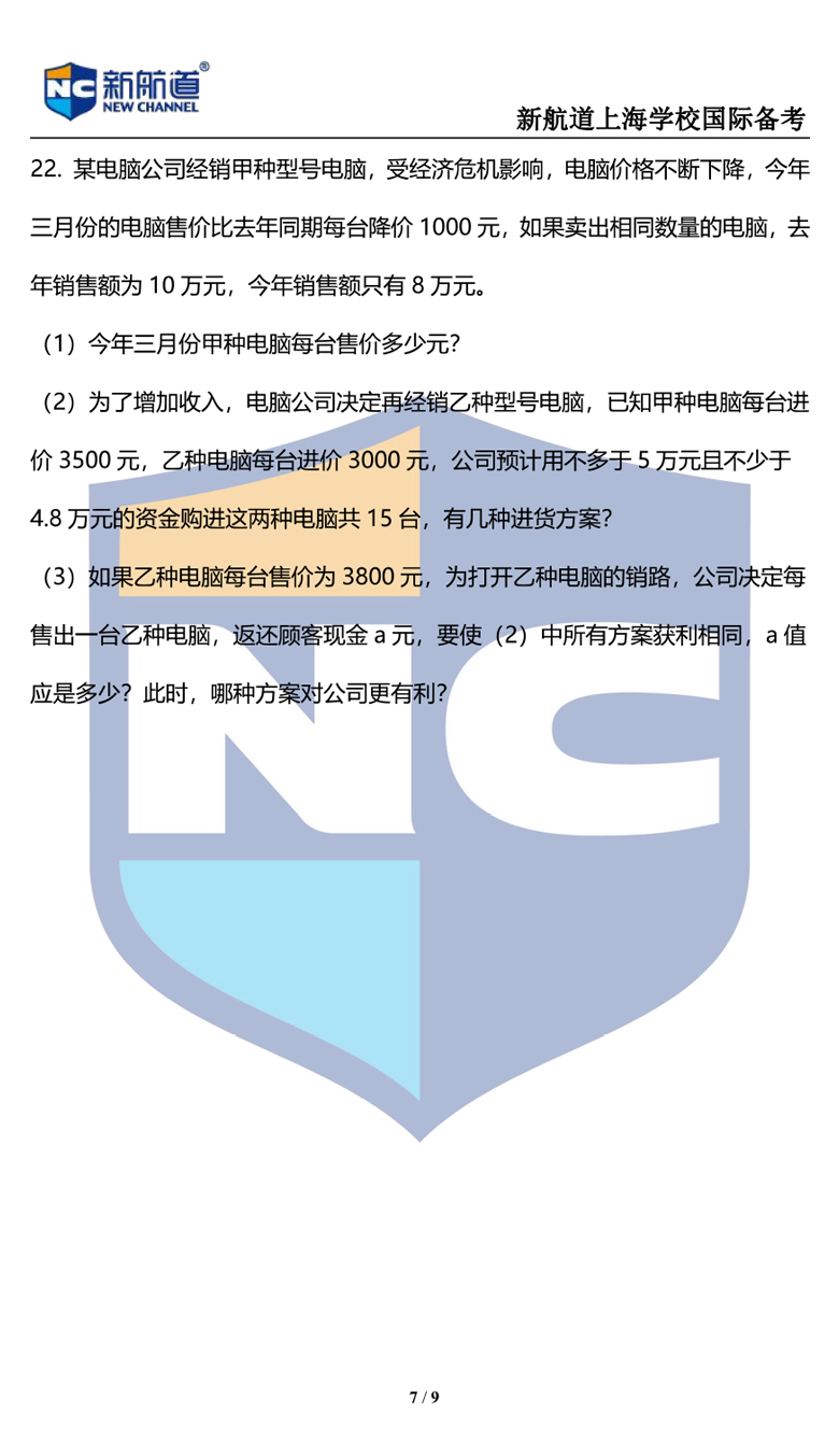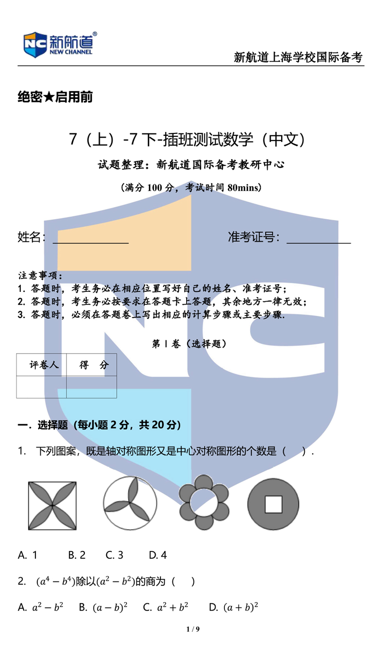 今天上海新航道国际学校小编,给同学们带来了"上海国际学校7(上)-7(下)-插班测试数学卷(中文板)"