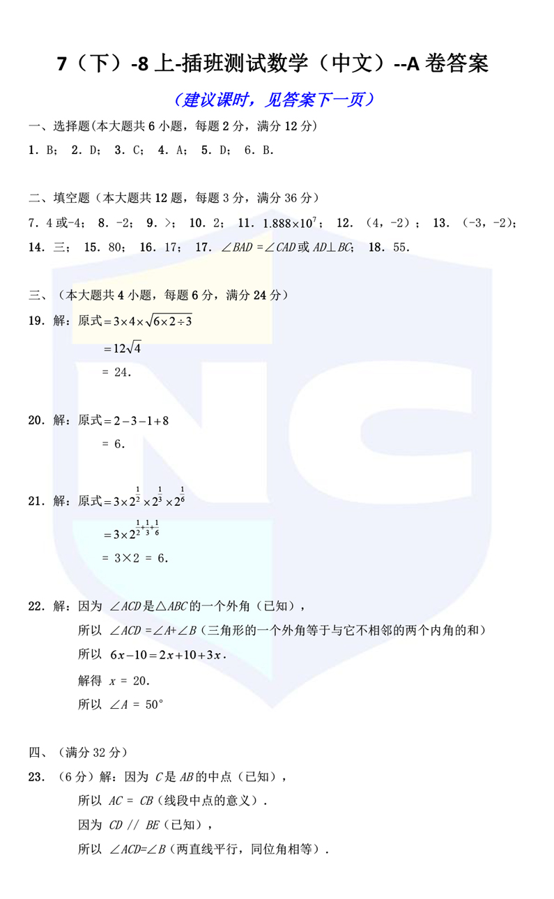 本文标题:上海国际学校7年级(下)-8年级(上)-插班测试数学A卷-答案(中文板)
