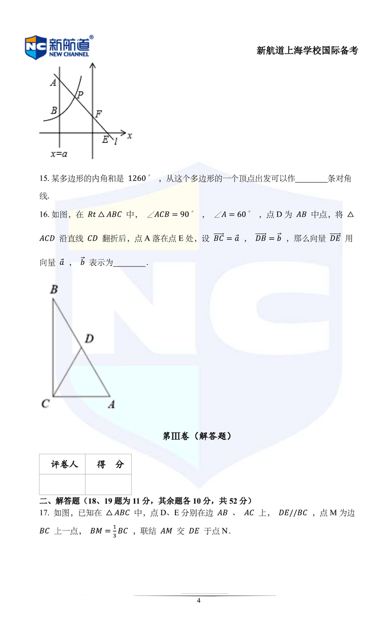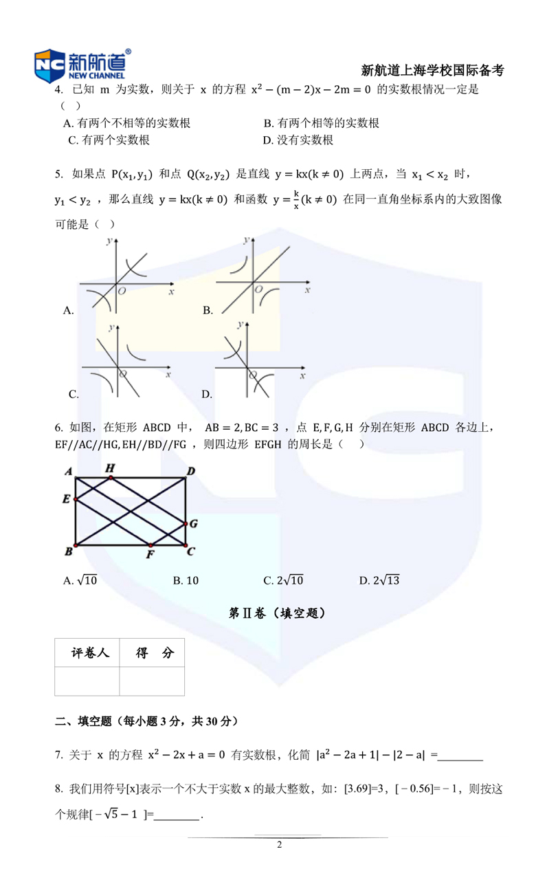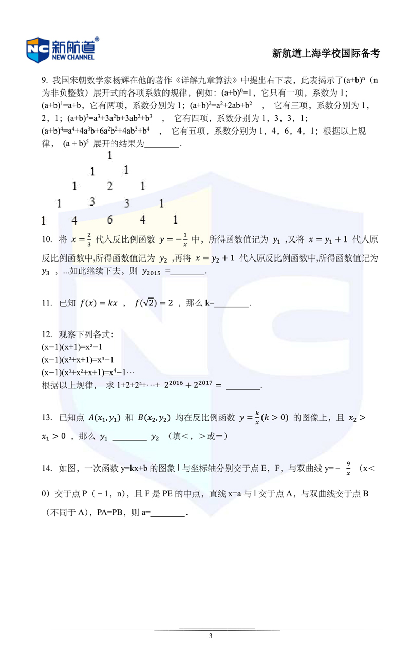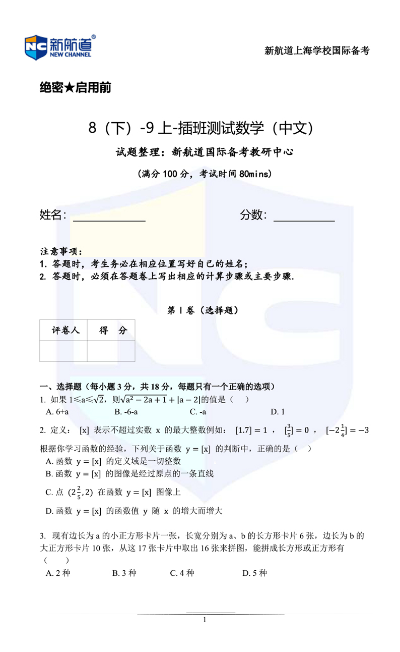 上海国际学校8年级(下)-9年级(上)-插班测试数学卷(中文板)+答案 等......