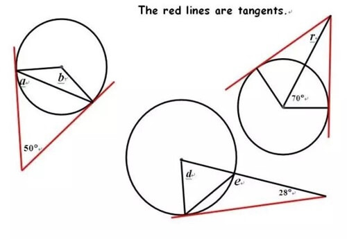 答案与解析:角b为130°,角a为65°。因为四边形的内角和为360°,∠b=360°-50°-180°=130°。50°角为顶角的等腰三角形的一个底角a为65°,角r为20°。两个直角三角形为全等三角形,故另一个圆心角也为70°,∠r=180°-70°-90°=20°,角d为62°,角e为121°。而在直角三角形中∠d=180°-28°-90°=62°。角d为顶角的等腰三角形的底角为59°,角e为59°的补角,所以∠e=121°。