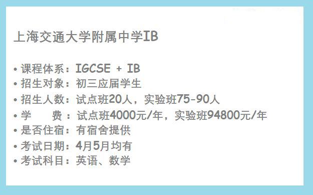 2019年,交中IB计划招一个20人的试点班/公费班,学费4000元/年,还招3-4个实验班,共75-90人。在招生考试中表现优异的同学,可以获得入读试点班的资格。试点班的学生高一时以中教教学为主,进行“普通高中课程+国际课程选修”的学习,并参加四门课程的统一上海市高中学业水平考试,除了IBDP文凭外还可拿国内高中毕业文凭。实验班的学生则是以外教教学和双语教学为主,学习“IB课程+中方选修课程”。