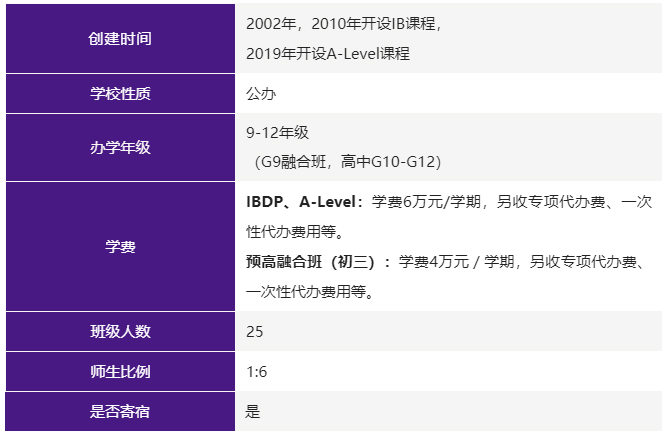 课程大纲放眼全球并兼顾本土信息。课程以培养学生好奇心以及终生学习热情,使他们为人生做好充分准备为目标,通过学习,培养学生有自信、负责任、善反思、重创新以及乐参与的精神品质。学生可根据A-Level课程的要求在高二选择4-5门课,在高三选择3-4门课进行学习,小班化教学。除中文外,全部使用英语授课。同时,渗透学术写作、学习方法指导、批判思维、升学指导与活动指导等核心课程。另设艺术与设计、TOEFL、IELTS、德语、西班牙语、网球、冰壶、游泳、篮球、心理学、戏剧、辩论和创客等选修课程。