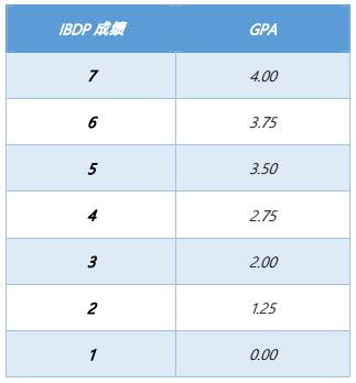 平均学分绩点(Grade Point Average,即GPA):GPA在美国以及世界范围内很多国家都是衡量学业水平的标准方法。GPA的多少是根据学生的阶段性成绩单进行计算得出的平均分,是学生学习能力以及学业水平的一种体现方式,满分为4分。下表是IB的评分体系与GPA之间的关系: