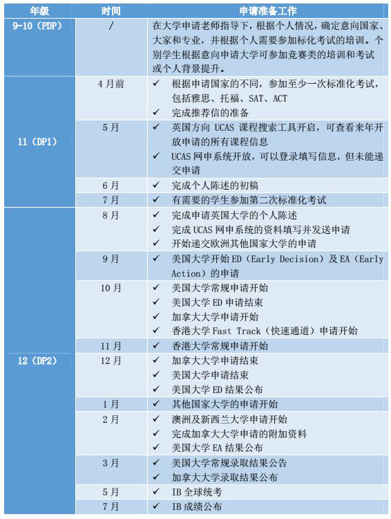 大学申请是一项长期有序的工作,申请人必须根据自己意向申请的国家、大学和专业做相应不同的准备工作。下面我们以现在就读于广州亚加达国际预科的IB课程学生为例子,大致罗列出IB学生申请的时间节奏和相对应的准备工作。
