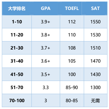 美国国内排名前100的大学的本科入学基本条件(注:满足这些条件并不意味录取)