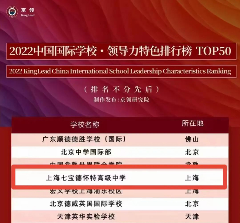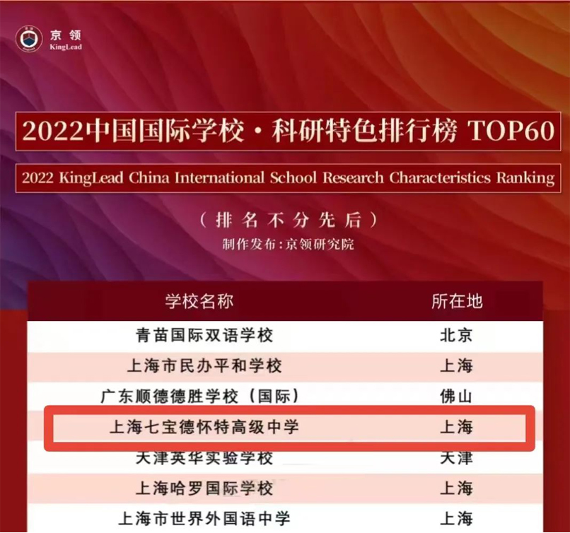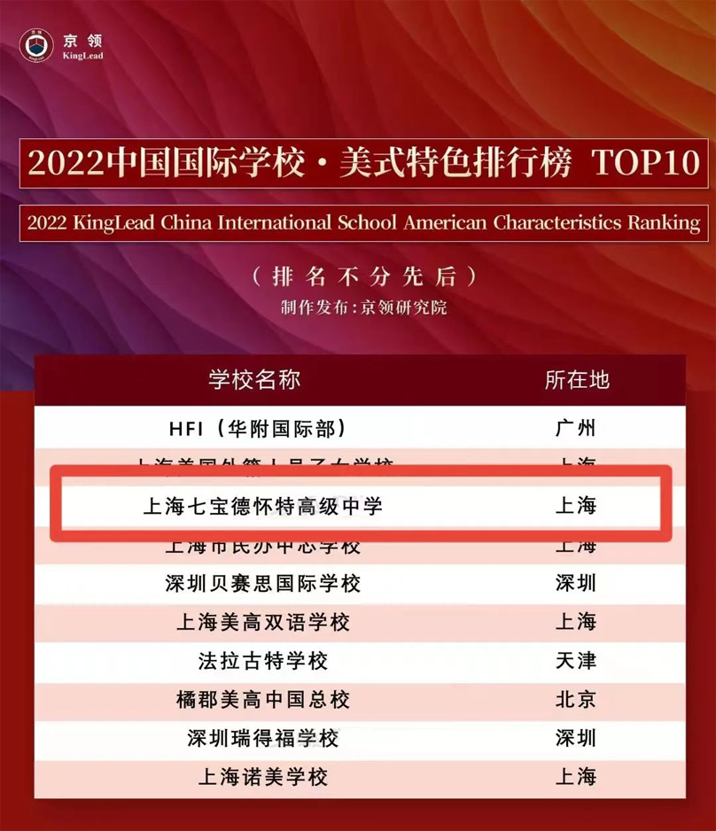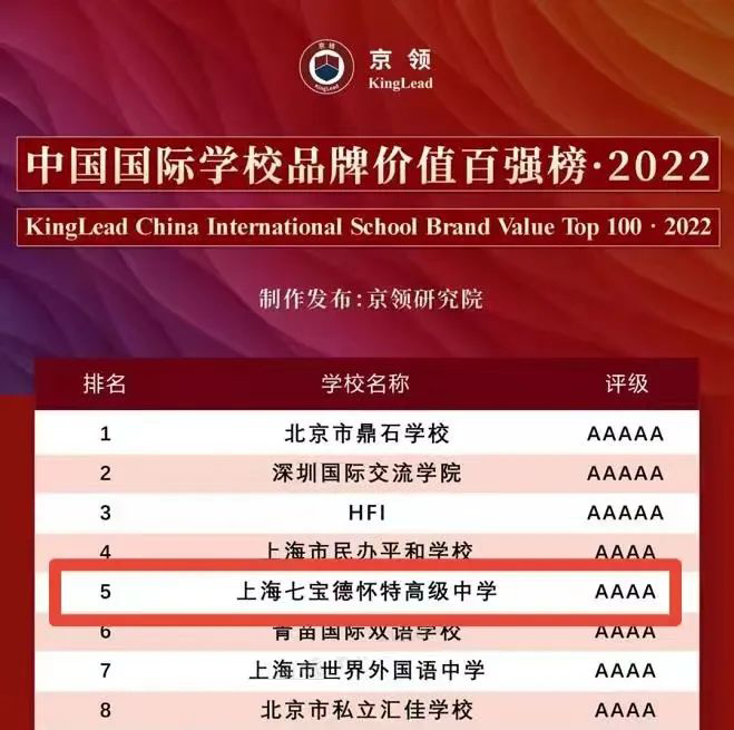 在由“京领新国际”发布的2022中国国际学校榜单中,七德荣登四榜,分别是2022中国国际学校竞争力排行榜(美国本科方向)、2022中国国际学校品牌价值百强榜、2022中国国际学校科技特色排行榜、2022中国国际学校美式特色排行榜和2022中国国际学校领导力特色排行榜。
