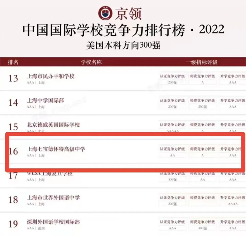 2022中国国际学校竞争力排行榜上,七德位列美国本科方向全国第16名: