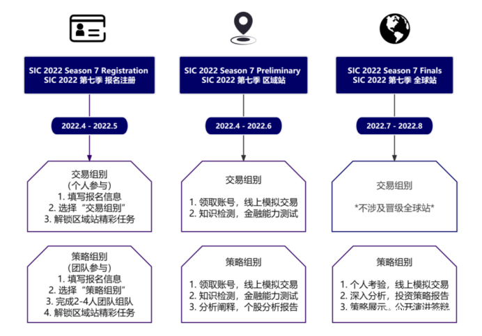 共设有两种组别:交易组别、策略组别,涉及到的参与时间和环节不同,具体参与形式如下:
