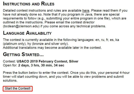 然后就可以参加比赛啦!选手需要在比赛开放期间进入竞赛页面参与比赛。如下图所示,点击“Start the Contest!”键即可开始比赛。选手的比赛用时就会立即倒计时,且无法暂停。