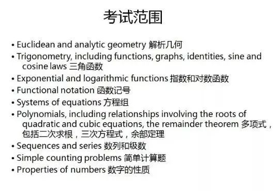 欧赛的知识点考察非常平稳,主要集中在基本代数运算与方程求解、数列、多项式、平面几何、解析几何、数论、三角恒等与三角函数、排列组合与概率、对数等模块。欧赛更加注重对学生数学逻辑的考察和培养,对解题过程有更高的要求。