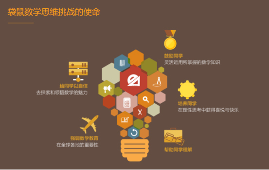 不同于传统奥数强调的高难度和挑战性,袋鼠数学思维挑战宗旨是用有趣生动、接近生活的题目,激发孩子们数学学习兴趣及自信,培养学生数学思维,训练学生阅读、理解、分析和解决问题能力,适合各年级各种数学水平同学参加。因此,袋鼠数学思维挑战逐步风靡世界,成为全球极具影响力的青少年国际数学思维挑战, 87 个国家和地区举办、每年超过 630 万学生参加。传统数学强国例如俄罗斯、德国每年分别有 100 万左右青少年参与,法国、巴西、捷克、波兰等国每年分别超过 30 万青少年参与,西班牙、奥地利、荷兰、瑞典等国家分别超过 10 万青少年参与。袋鼠数学思维挑战在美国已经有超过 20 年举办历史,每年参与人数快速递增,尤其在亚裔人口较多的加州每年袋鼠数学参与名额一位难求。