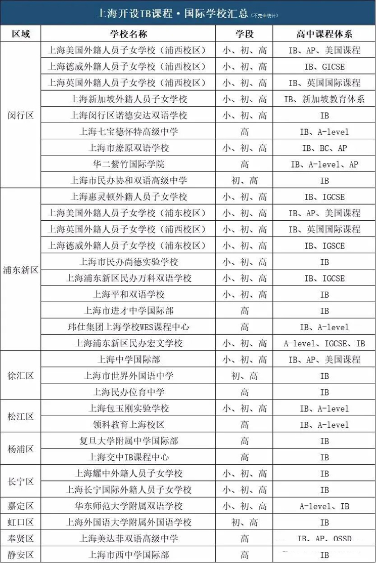目前,上海开设IB课程的学校,几乎集中在生源质量前列的学校:上海中学国际部、复旦中学国际部、世界外国语中学、平和双语学校、包玉刚等。