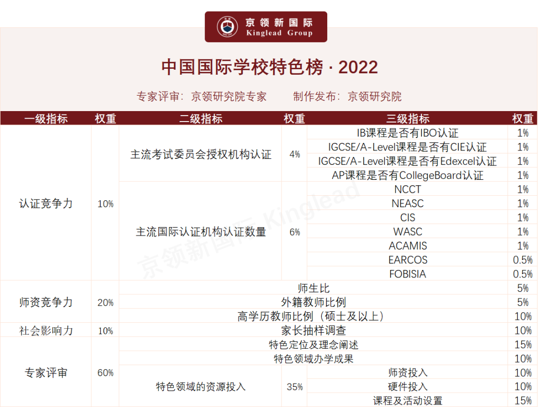 本次榜单的各项指标都是家长们非常关注的,包括认证竞争力(10%)、师资竞争力(20%)社会影响力(10%)、专家评审(60%)。