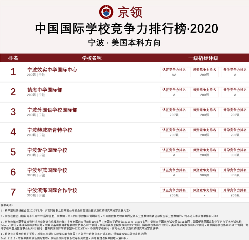 宁波滨海国际合作学校在《中国国际学校竞争力排行榜·2020》中美国本科方向上榜。
