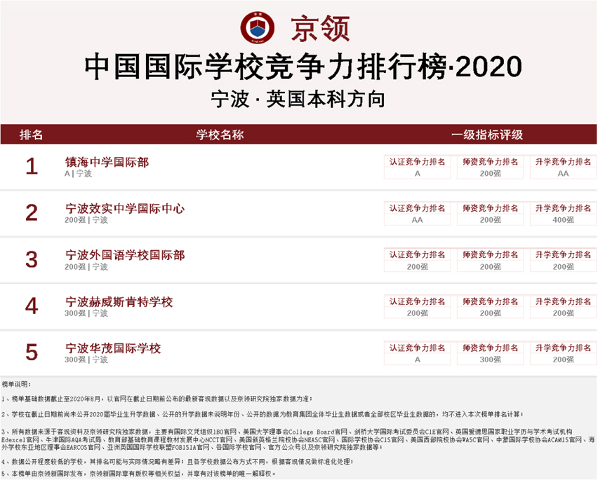 宁波外国语学校国际部在《中国国际学校竞争力排行榜·2020》中英美本科方向排名前200强。