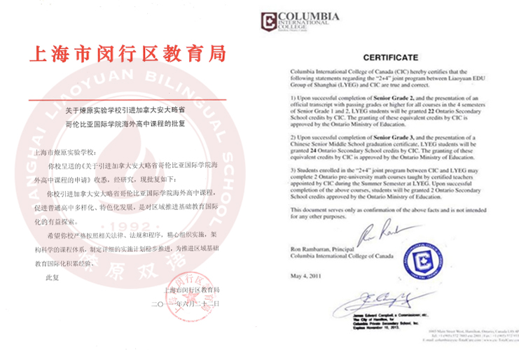小学、初中、高中学历教育牌照齐全,国际课程取得闵行区教育局批文支持;拥有国际文凭组织IB-DP项目、CAIE剑桥大学国际考评部、美国大学理事会、英国爱丁堡公爵国际奖、小托福考试授权考点等战略合作和授权认证;与加拿大哥伦比亚国际学院(CIC)、美国百年名校伍德斯托克学校合作办学多年;是上海市资质最全的国际化学校之一。