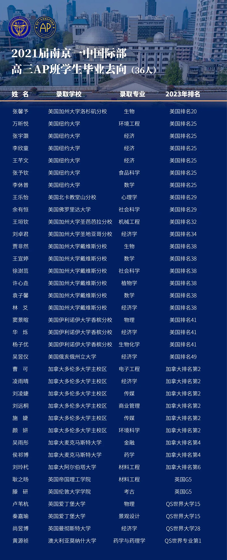 零失败。考入一中AP班就等于跨入全球名校。一中AP班9届毕业生每一个学生都是一个成功的案例,近三年更是几乎全部被美国前50,英国前10,加拿大前5以及世界排名前50的名校录取。(近三年毕业生去向见文末)