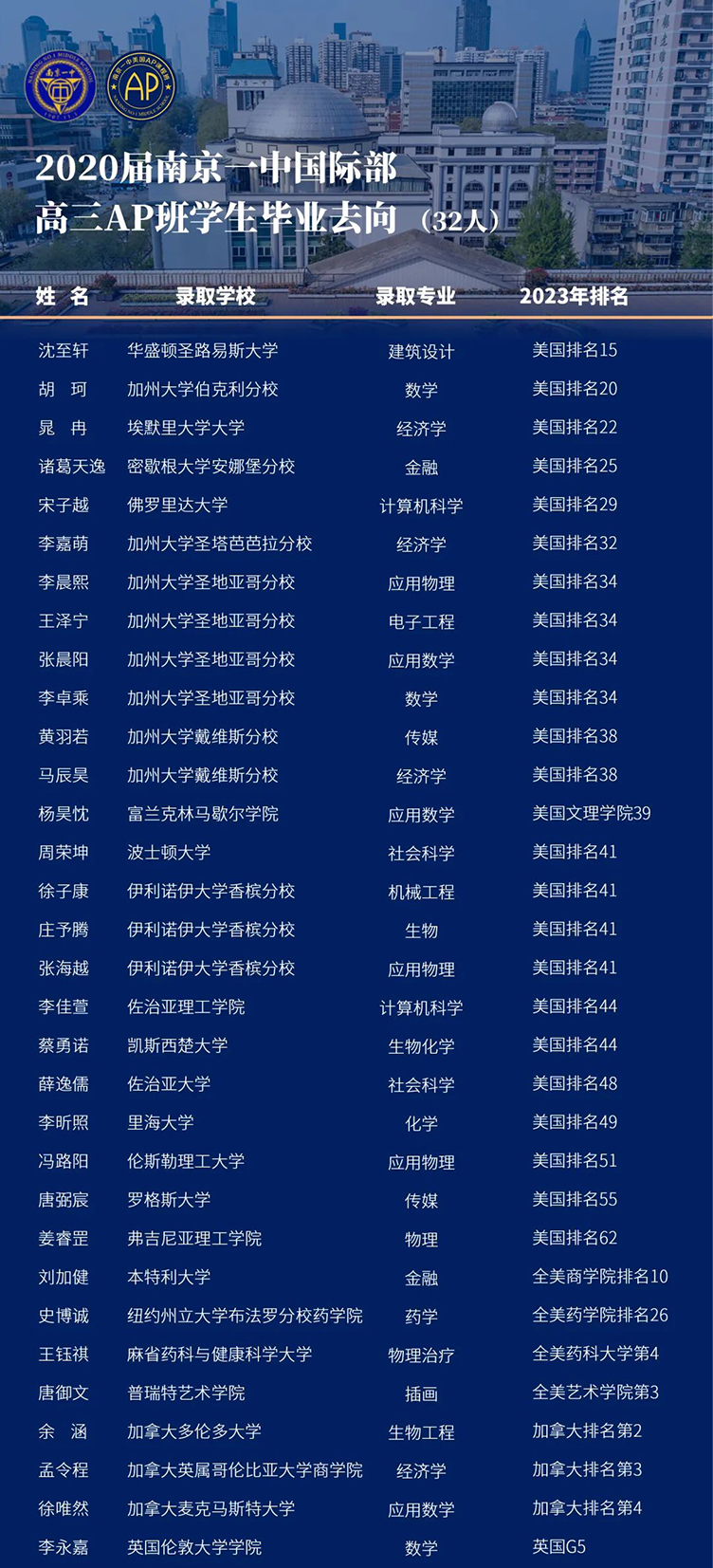 潜力大,后劲足。一中高质量全学科的AP课程为学生的高中阶段打下坚实的学科基础,不仅让学生在本科申请阶段受益,更助力他们大学后的学习。一中AP毕业的学生表现出强大的学习后劲,很多本科毕业的学生研究生阶段都升入美国排名前20的顶尖名校。(本科毕业研究生去向一览表见文末)