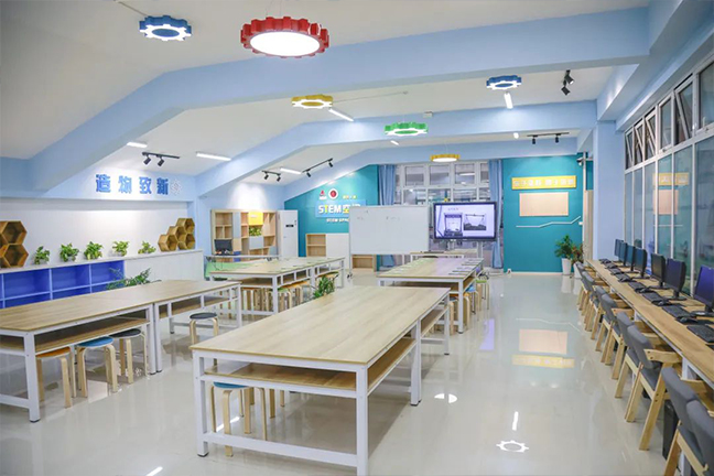 科技类室场细节处迎合了学生身心发展的特点,激发学生天马行空的想象力和创造力。教学区、讨论区、机器人比赛区、乐高搭建区和创意编程区,指向多元化发展的目标。