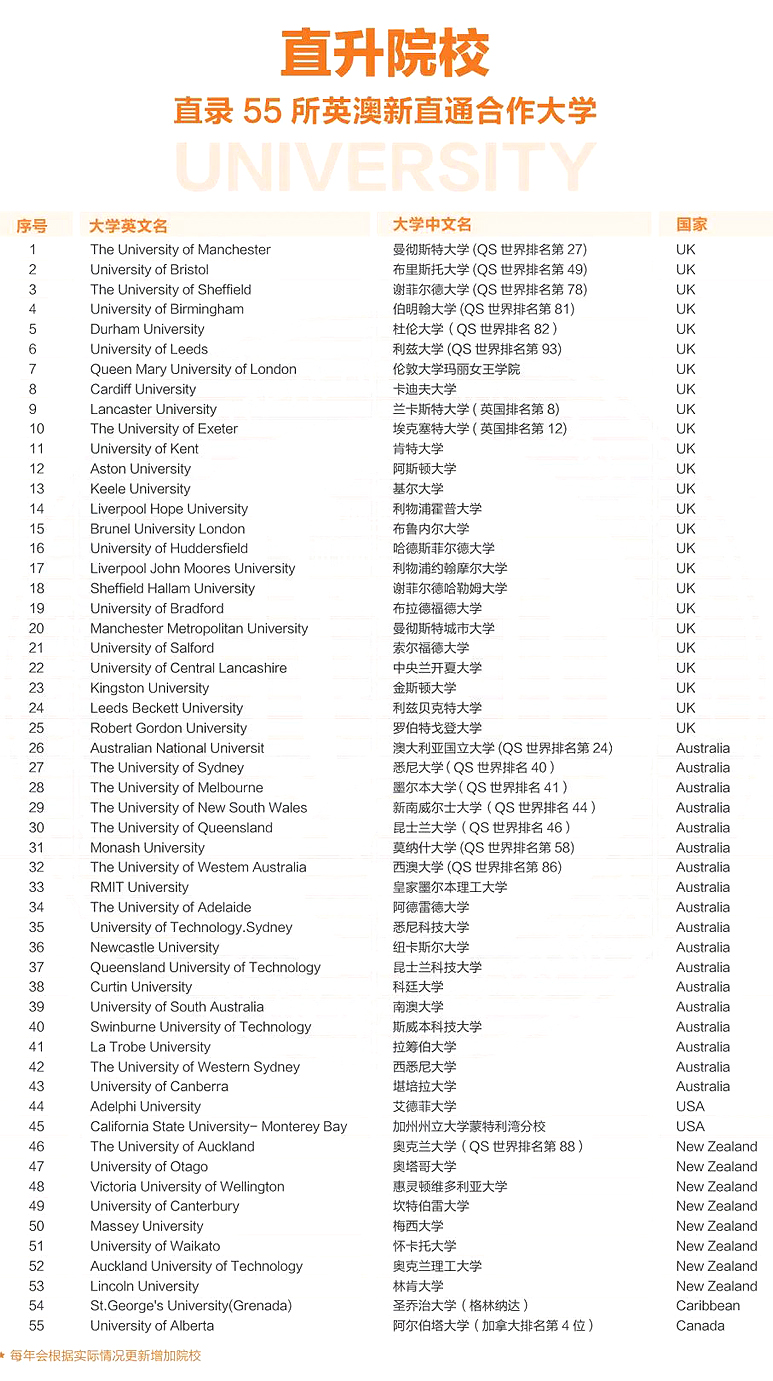 免托福免雅思。学校开设的IFY课程,是为中国学生顺利升入英国、澳洲成员大学就读本科而量身定做的桥梁课程,学生完成学习后可直升成员大学,就读大学本科学位课程。目前成员大学涵盖了英国、澳洲、加拿大等国家。