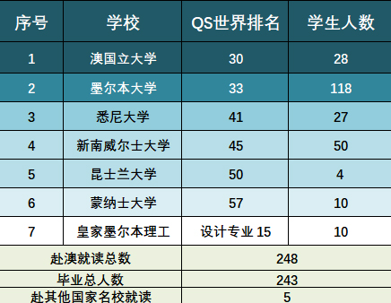 我校2016届 - 2022届七届澳洲方向实验班毕业生100%被世界排名前50强的墨尔本大学、新南威尔士大学、悉尼大学等澳洲G-8(八大五星名校联盟)世界顶尖名校(本科段)录取,录取率达100%;70%的毕业生进入G-8中的前三所名校(世界TOP30-40)。吴越舟同学、涂司瑞同学,楼兰同学及许瑞珊同学先后获新南威尔士大学预科类全球统考状元。历届均有学生获得多校奖学金,每年总累计10-15万澳币不等。