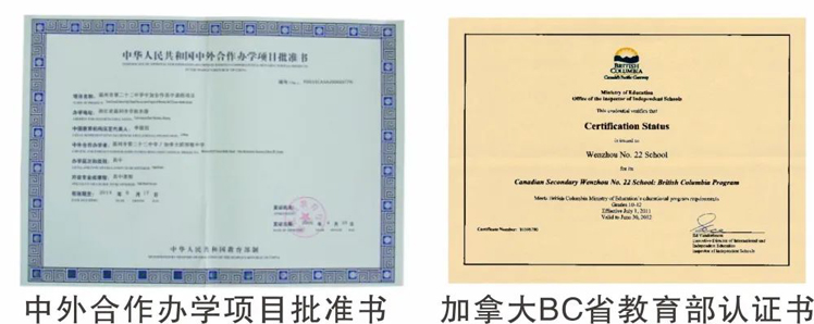 我校于2006年与加拿大BC省新西敏市教育局合作创办中加合作高中课程项目(加拿大高中),是经浙江省教育厅批准、国家教育部备案,并通过加拿大不列颠哥伦比亚省(BC省)教育部认证的中外合作办学项目。