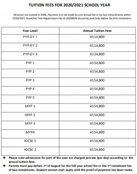 学校学费不包括午餐两点费,春夏校服费。您可以选择缴纳半年或一年的学费。如果需要乘坐班车,请提前预交一个月费用。