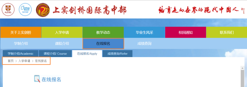 考生可在上实剑桥的官方网站入学申请栏注册并在线报名,成功提交信息后,学校将在两个工作日内通过电话与家长确认,请注意来电。如您因意外情况未收到确认电话,请与学校电话联系。