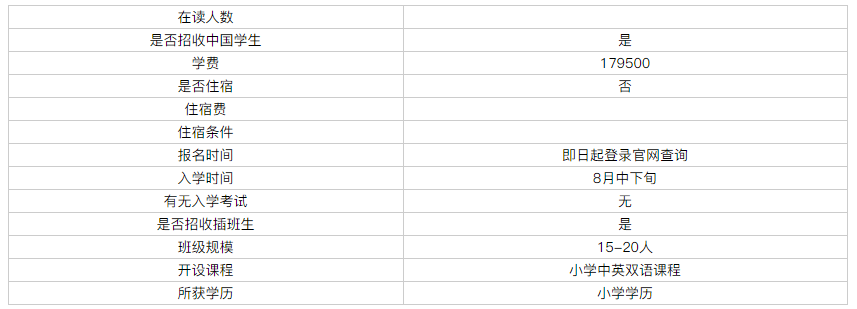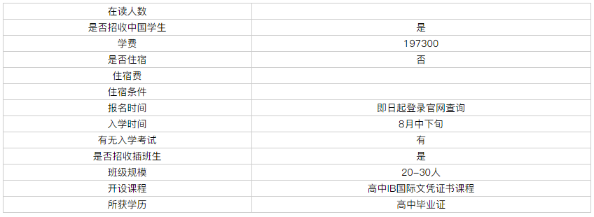 学校设施:16英亩欧式设计教学楼。能容纳500人的剧院及另一个教室大小的剧院。一个室内体育馆,2个室内游泳池,舞蹈房,篮球场,全尺寸草坪和一个足球场及两片活动区域。在中学楼内建有一个全开放式,自然光亮的图书馆供幼儿园,小学中学全校师生使用,还有一个故事会剧场。一个自助食堂,两个咖啡休闲区。计算机房配置了苹果。独特的艺术工作室和视觉艺术教室;专业的录音棚,音乐,戏剧教室。所有教室宽敞,灯光通透适宜且配备空气净化装置。更多学校细节可在线联系新航道小编!