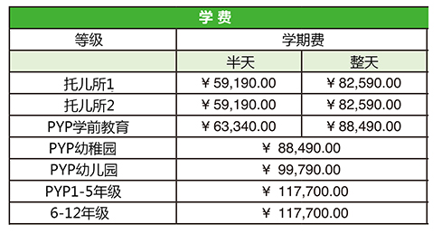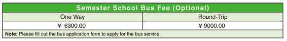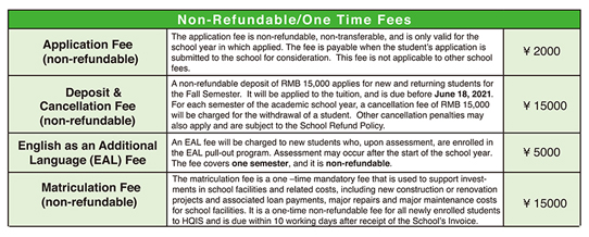 注:秋季学期6月8日之后入学,春节学期11月15日之后入学的新生,必须在开学前缴纳人民币15000元的不可抵扣押金。在收到学校发票后10个工作日内到期的剩余学费,在一个学期超过15个学日后入学的新生将按比例收取这个学期的学费