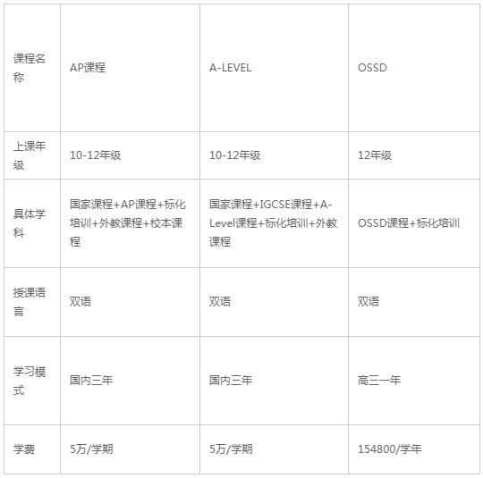 国际高中创办16年来,已经形成了包括美国方向的AP课程、英国方向的A-Level课程以及加、澳、英方向的OSSD课程等在内的多元化课程体系。在主体课程框架内还为学生提供标准化考试辅导(托福、雅思、SAT、ACT)、竞赛辅导、留学规划、大学申请、签证辅导等一系列个性化服务。
