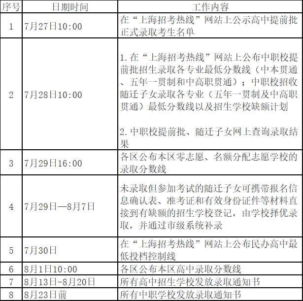 7月19日18:00起,考生可通过“上海招考热线”网站,查询本次考试成绩(注:八年级在籍在读考生初中学业水平考试历史科目成绩查询时间为7月23日),同时市教育考试院还将公布高中阶段各类学校最低投档控制分数线。对本人考试成绩有疑问的考生,可于7月20日至21日通过“上海招考热线”网站申请成绩复核,并于22日通过“上海招考热线”网站查看复核结果。