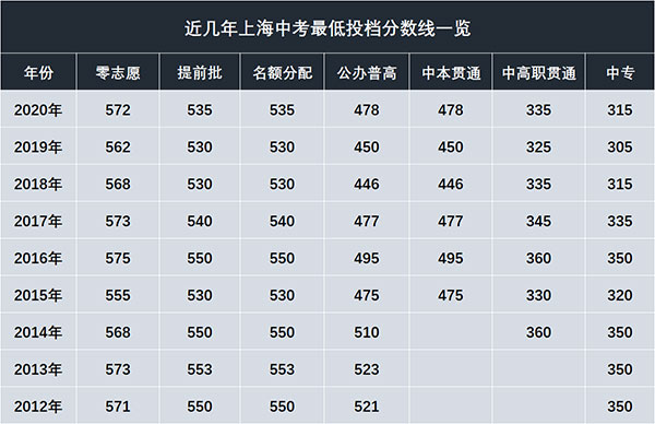 2020-2012年上海中考最低投档分数线: