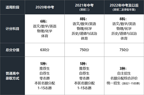 2021年实行新中考的第一年,计分科目和考试方式做了调整,计分科目总分由630分调整为750分,新增两科:历史60分+政治60分。而从2022届中考开始,将实行“计分科目”+“招生录取政策”的全面改革,如图: