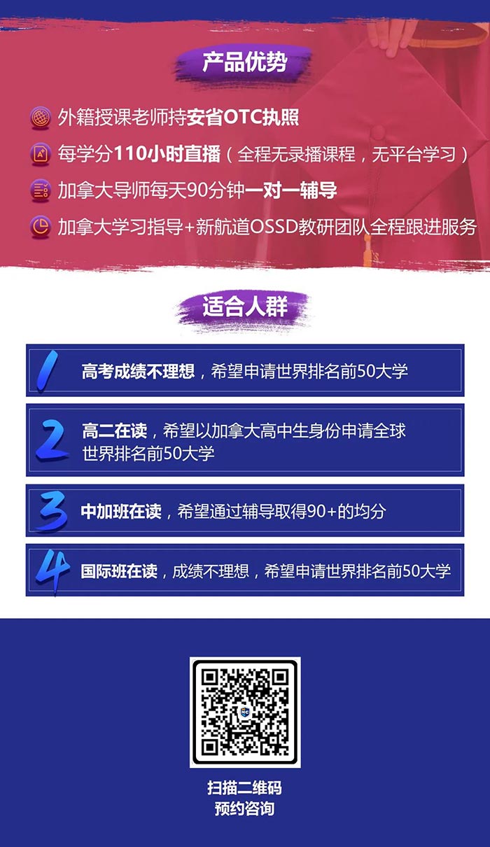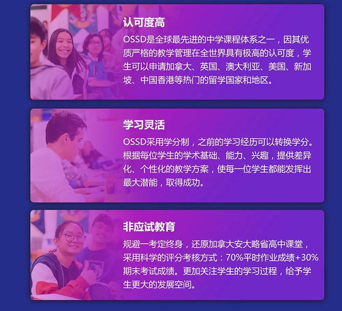 第一类就是如果学生高考成绩或高中成绩不理想,还有一类就是其他国际课程体系在读但不适应的学生,想以加拿大高中生身份申请理想的大学。OSSD就非常适合这两类人群。