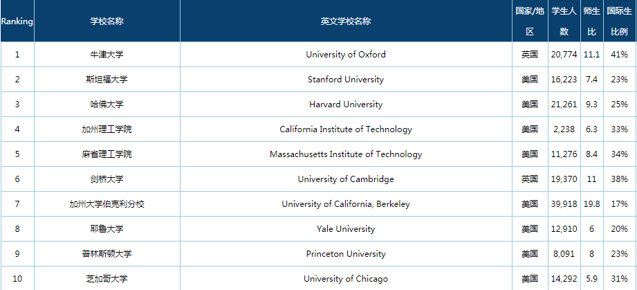 下表就是2021年泰晤士报世界大学排名前10的学校信息。