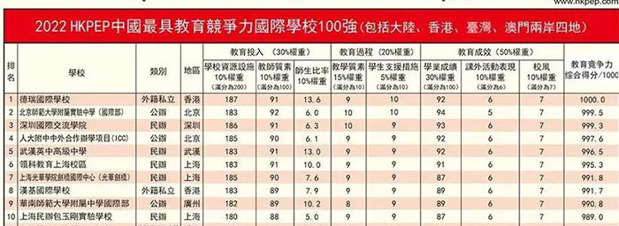 近日,香港专业教育出版社发布2022年中国最具教育竞争力的国际学校100强,覆盖中国大陆和港、澳、台两岸四地的学校。