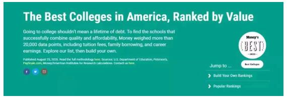 《Money》杂志就结合了美国教育部、Peterson's、PayScale的数据,对739多所美国大学的性价比进行了全面的分析比较,这些学校需要满足: