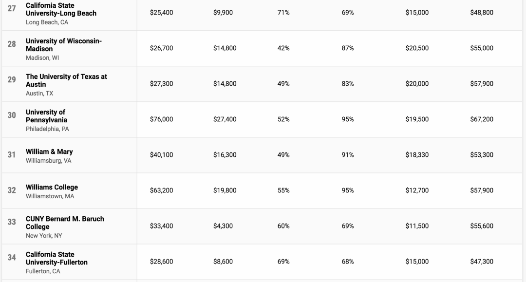 3、教育产出(30%):毕业生收入、不同专业收入调整、入学10年后收入、增值收益、学校就业成果、社会经济动态指数