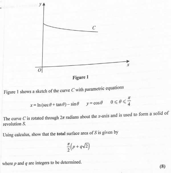 这题的难点大多数学生在用积分计算表面积的时候卡在了根号里的式子化简上,另外还要注意的是这里求的是total surface,所以考生要记得加上的圆形上下面积。