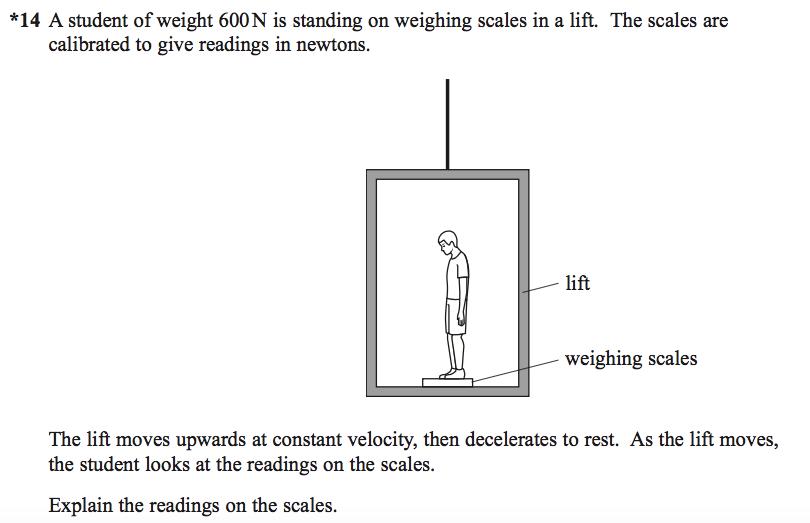 题目中,constant velocity以及decelerate是破题的信号词。在分析resultant force的时候,不知道各位有没有讨论reaction/upward force和weight之前的对比呢?