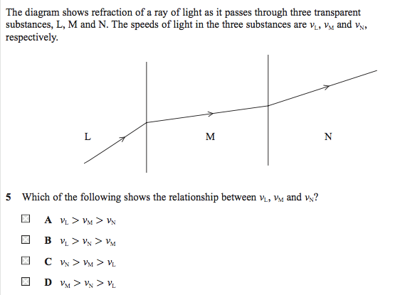 分析一下,光在经过三种不同的透明介质以后,光路发生了不同程度的折射(refraction)。而折射的程度大小又关联了refractive index(折射率)的大小,进而可以对不同介质中光传播速度进行对比。而这,直接影响了光路到底是bend to the normal还是bend away from normal~